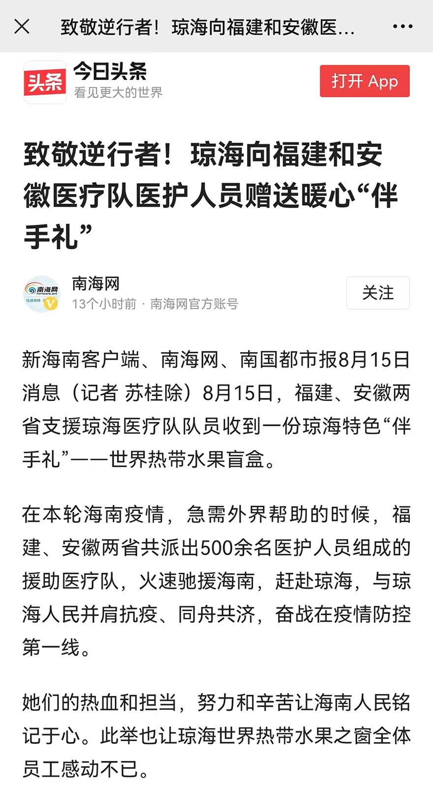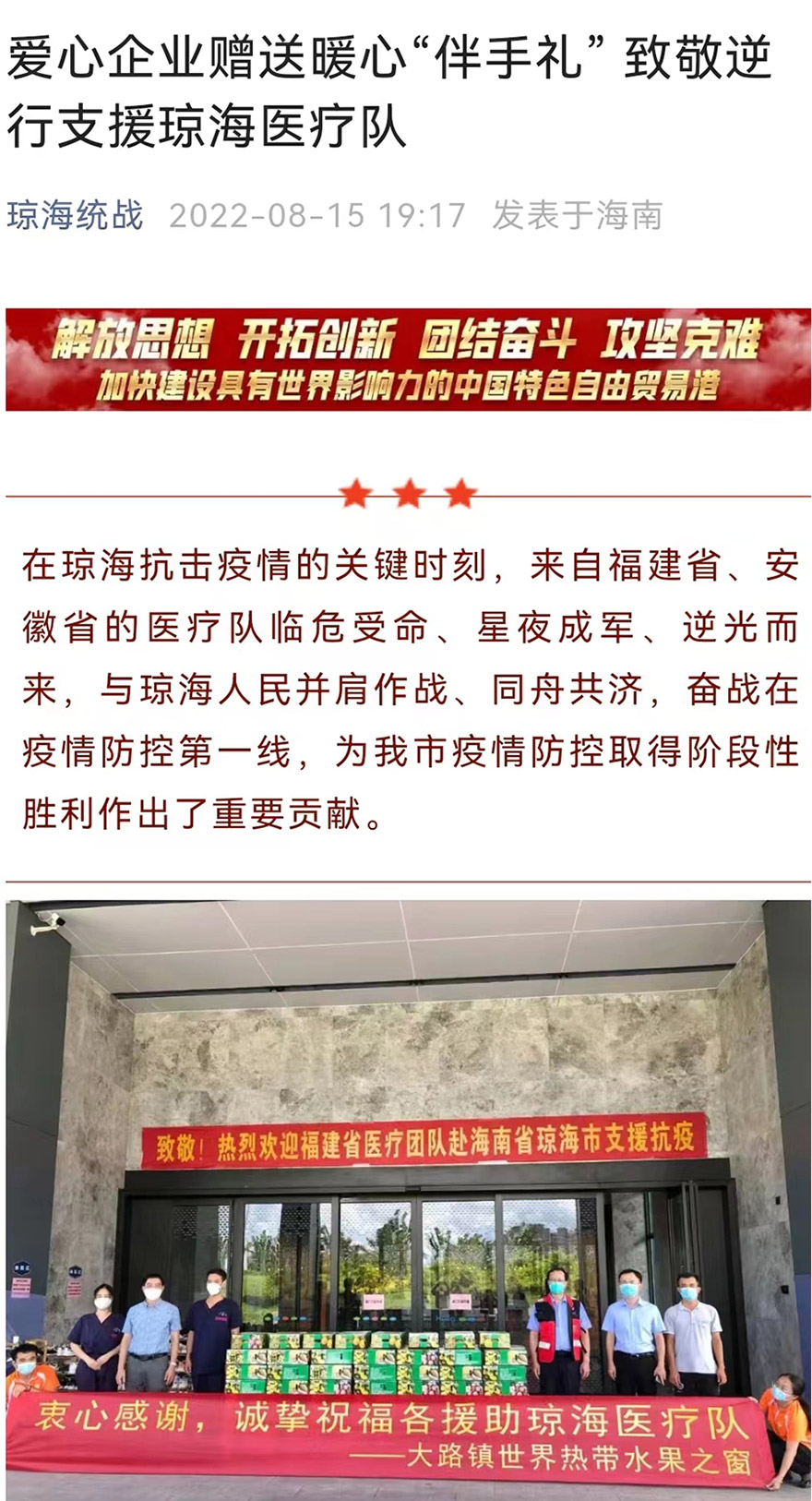 一(yī)方有(yǒu)難八方支援,是(shì)刻在中國(guó)人(rén)骨子(zǐ)裡(lǐ)的(d©e)信條,在海(hǎi)南(nán)疫情發散,急需幫助的(de)時(shí)候,援助瓊海(hǎi)的(de)512名醫(yī)療隊員(yuán)身(shēn)披光(guāng)明(míng),火 (huǒ)速馳援海(hǎi)南(nán)。她(tā)們的(de)熱(rè)血和(hé)擔當,努力和(hé)辛苦讓“海(hǎi)南(nán)雷公馬”們感動不(bù)已。更讓世界熱(rè∑)帶水(shuǐ)果之窗(chuāng)(新華通訊社山東分社)全體(tǐ)員(yuán)工(gōng)₩,想用(yòng)世界佳果犒勞我們的(de)抗疫英雄們,表達崇敬之情和(hé)愛(ài)心。